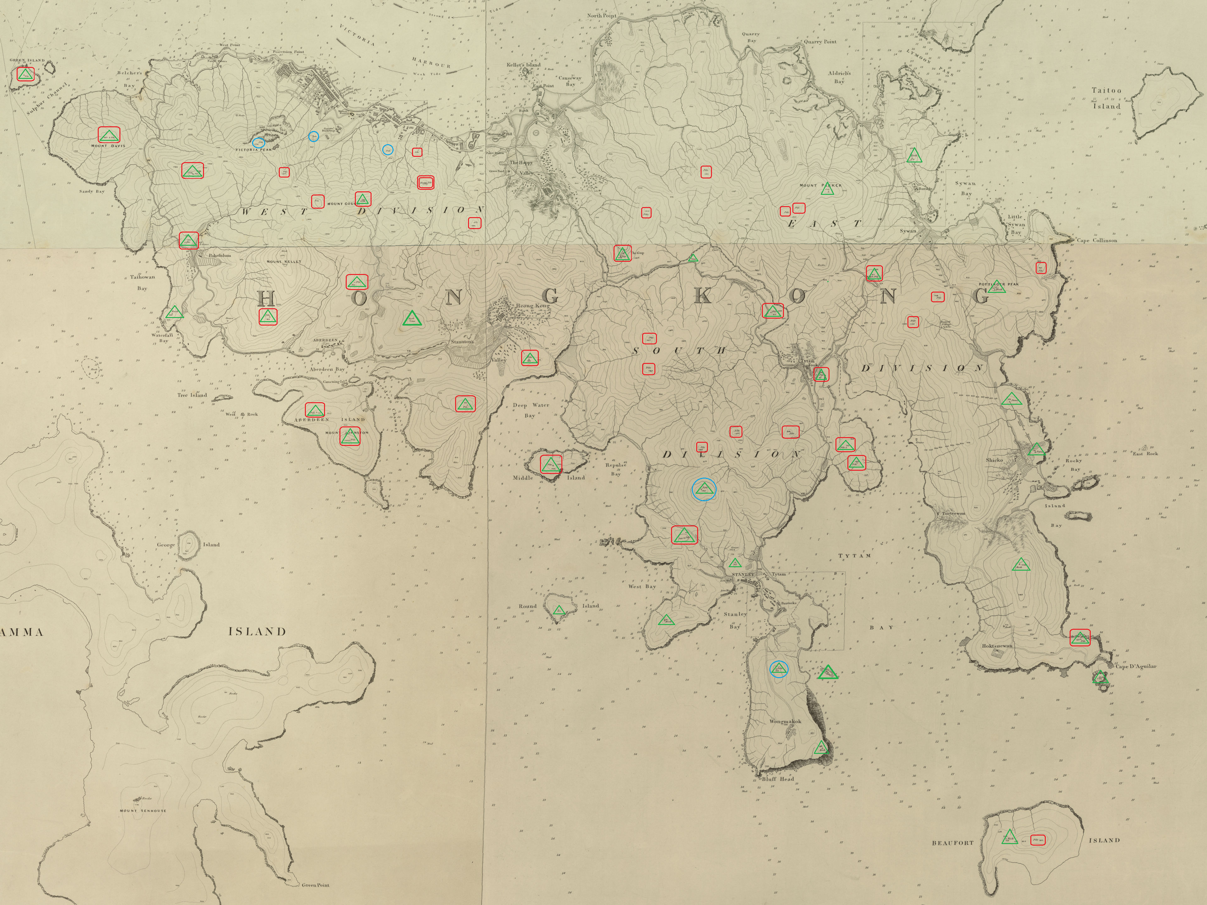 1845年地圖如無意外是香港第一張以等高線標示山體高度及標示有三角測量站的地圖。地圖紀錄了多個大地測量點,部分標示為「Pile」、「Double Pile」及「Pole」。筆者嘗試整理一下,並以下列圖案標示各個測量站位置: