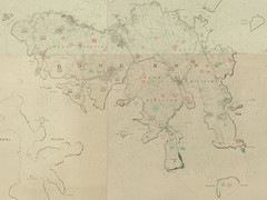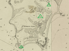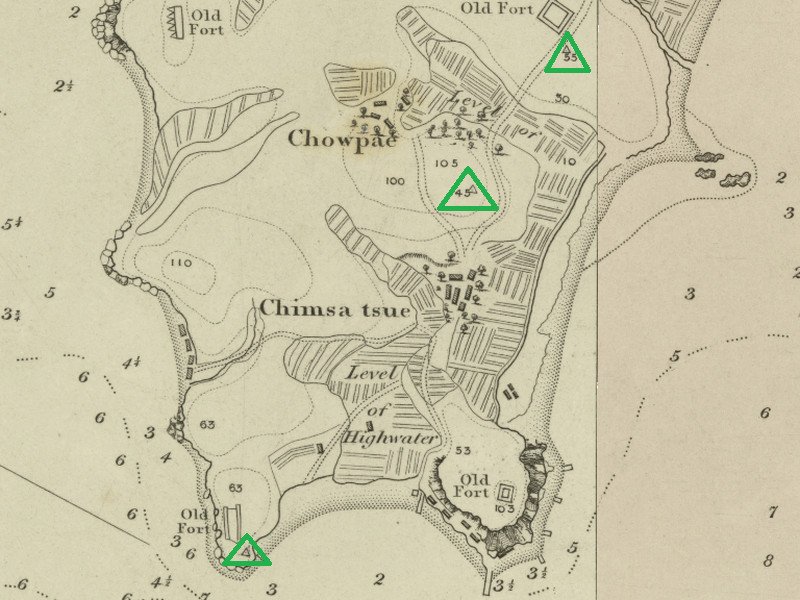 - 九龍半島有兩條村,分別為「Chimsa tsue」及「Chowpae」,中文可能名為尖沙咀及草排/左排;另外油尖區有四座「Old Fort」及九龍城有一座「Stone Fort」。