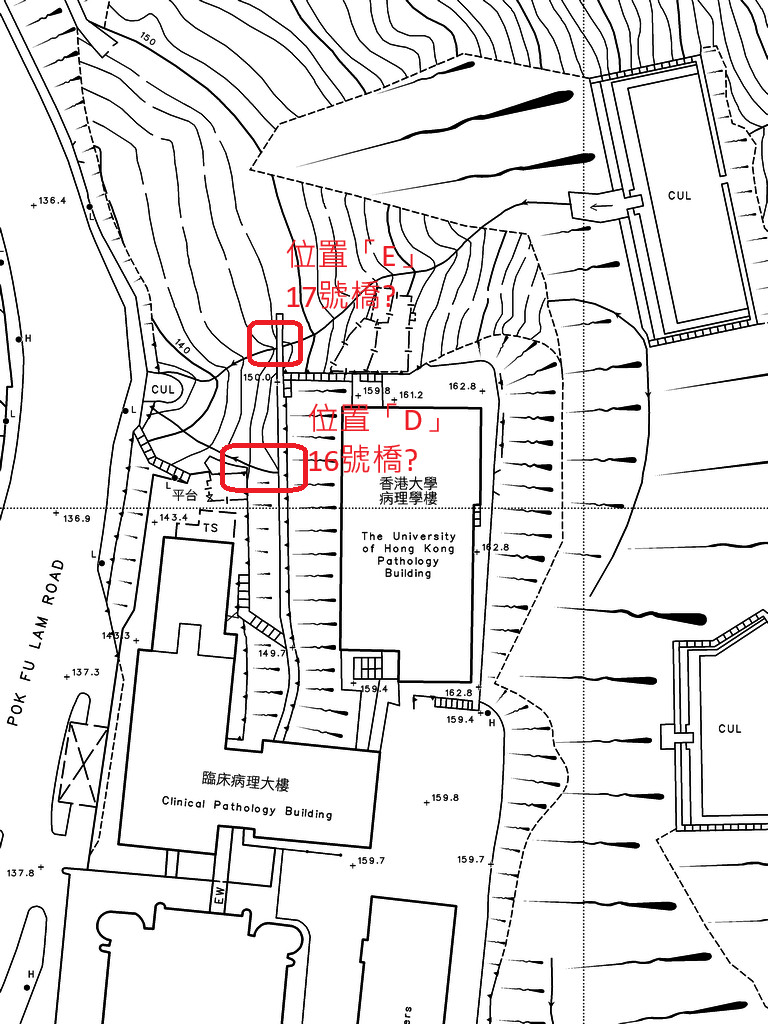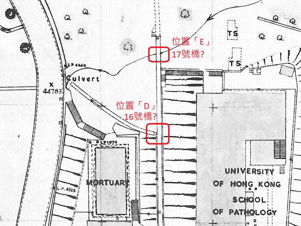 - 參考1964測量圖年及1969年測量圖(1964年原圖,1969年原圖),估計有兩個位置比較有可能是3號及4號橋所在地,圖中位置「A」是山谷,有可能是溪流;位置「B」的下方有一個暗渠 (Culvert),1969年測量圖標示上方斜坡有一道水渠。