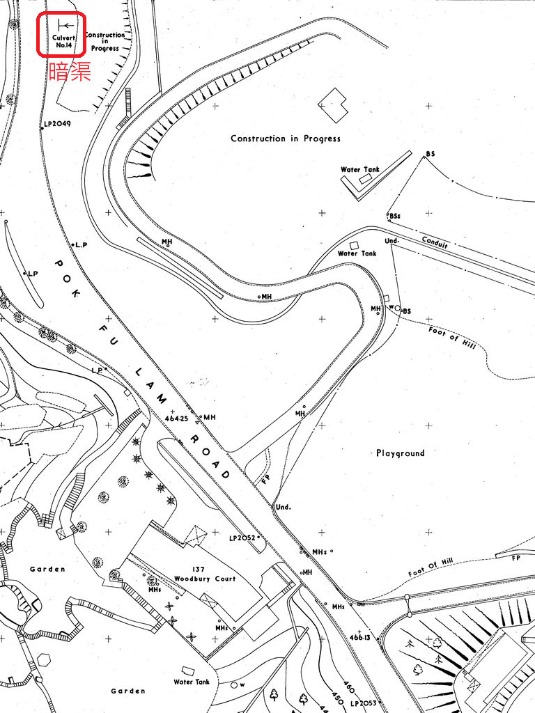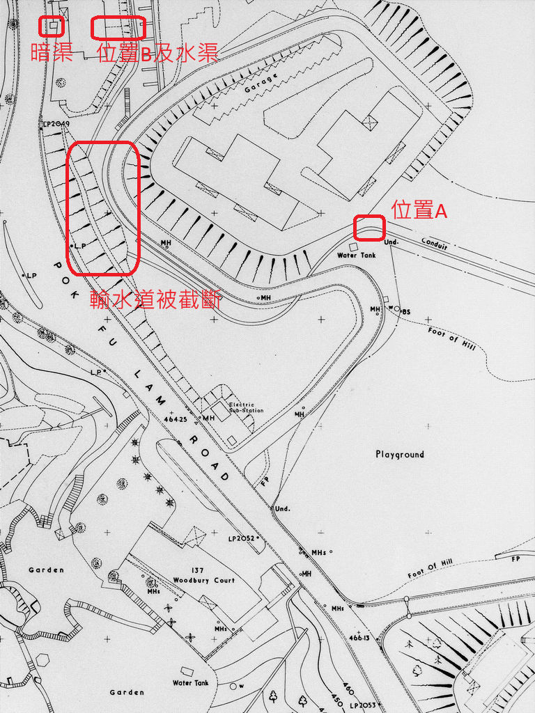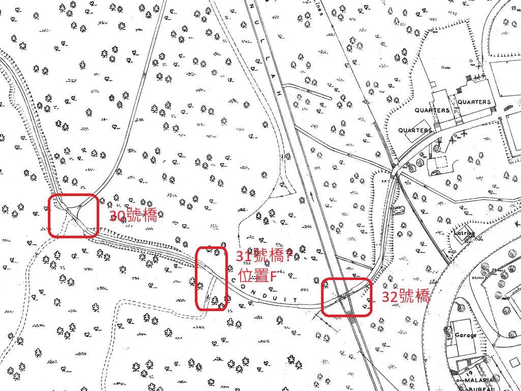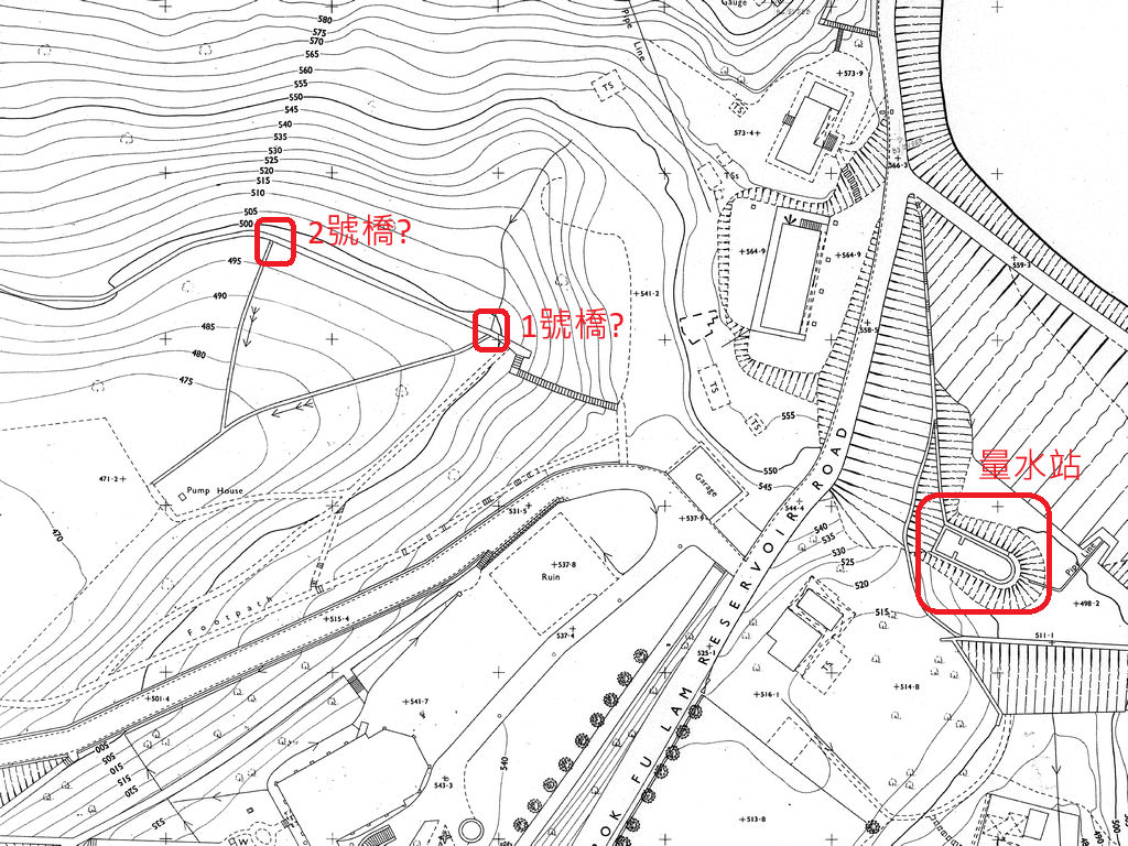 - 參考昔日測量圖(原圖),估計1號及2號橋於興建大學宿舍時被拆除,輸水道亦被更改。