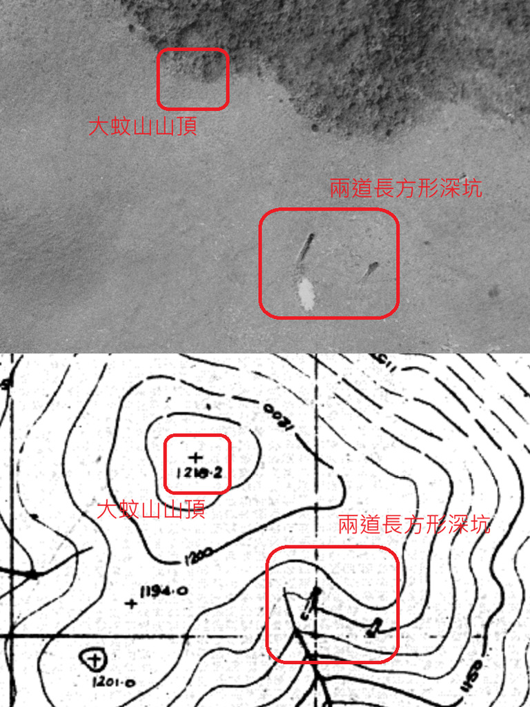 相傳西貢有兩個結界,一個是担柴山,另一個是大蚊山(又名大門山、大坳門山、桔仔樹山)。担柴山約一年前到訪過,而筆者對上一次登上大蚊山,是數碼相機未普及的年代。查看昔日航空照片(1963年、1982年),山頂東西面山脊線是分水嶺,分水嶺北面比較多植物,南面比較「光禿禿」。當期時有三條明顯路線通往大蚊山山頂,分別是位於東南、西南及北面,東南面小徑接近山頂有兩道長方形深坑,1963年航空照片(原圖)及昔日測量圖(原圖)都可看見。時至今日,東南面小徑已經變成「結界」,近年很少聽到有人成功利用此路線往來大蚊山。今次行程重溫當年路線,由西南面登山,然後下降到大浪坳。