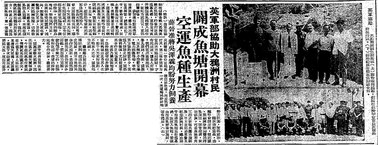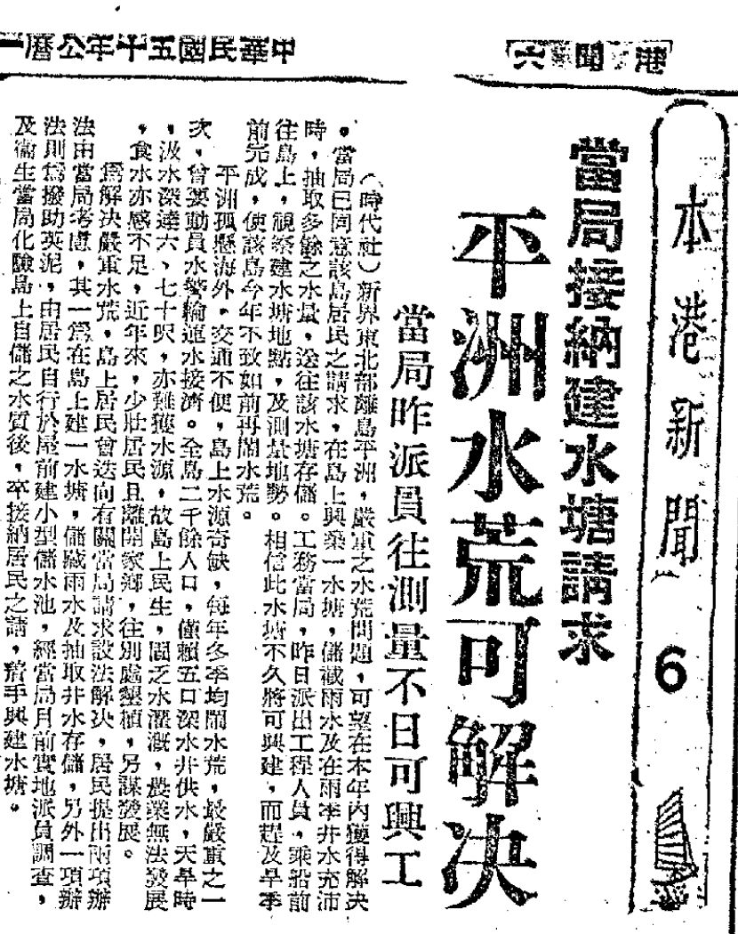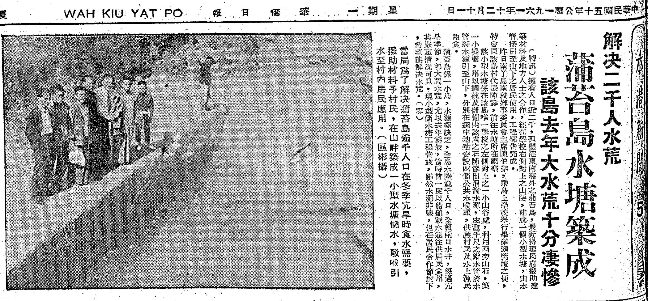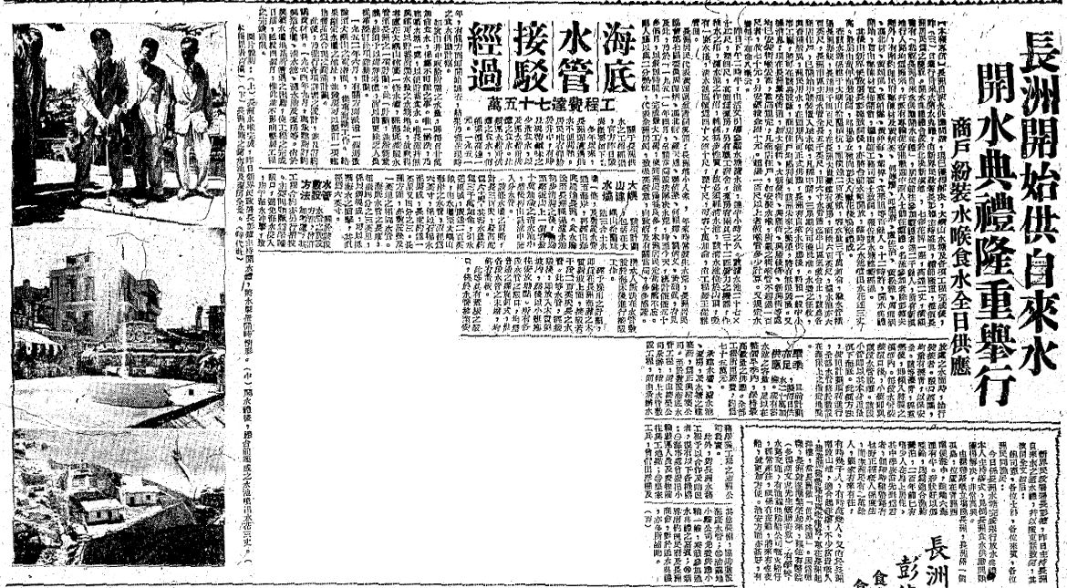 1956年落成(昔日報道),隨着十塱水塘落成,政府鋪設海底水管為喜靈洲居民供水。 |