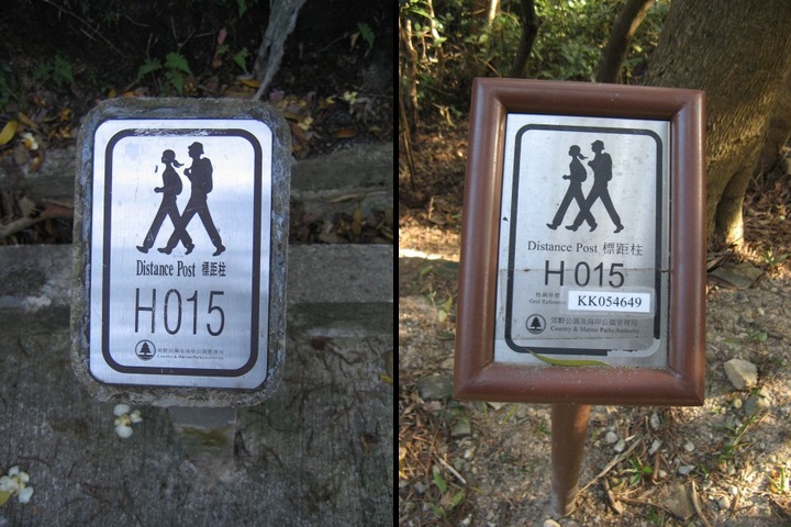 根據筆者記錄,港島徑標距柱H015初期(相片攝於2005年)是豎立在石屎路旁,之後(相片攝於2014年)則豎立在行山徑上,似乎曾經移位。