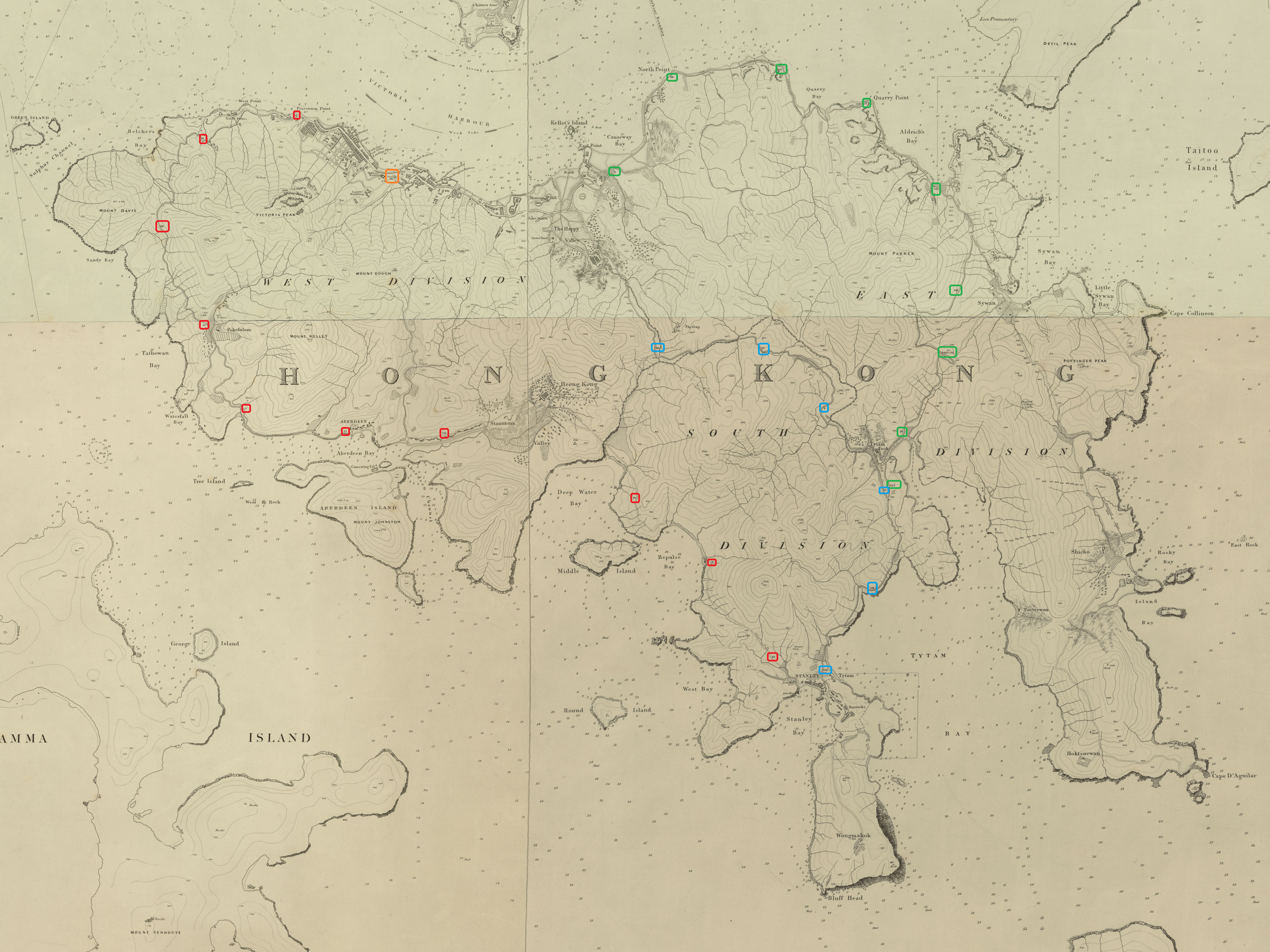 - 地圖上有一條名為「Heong Kong」的村,估計是現時的黃竹坑舊圍。