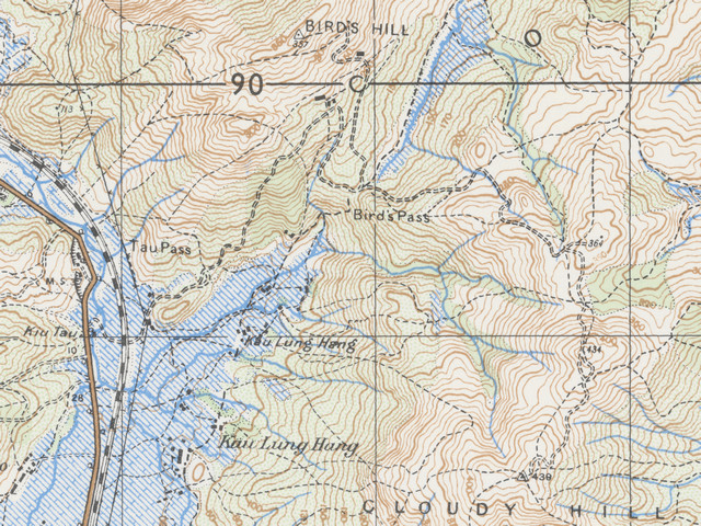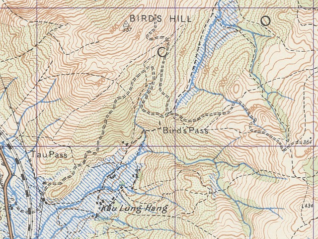 根據地圖的標示,Tau Pass是位於龍山與北大刀岃之間的山坳,它是Birdy Jeep Track與Tau Pass Jeep Track交滙點,地名不知是否跟「橋頭(Kiu Tau)」有關。 參考1952年的地圖:已經有車路(現今的牛牯嶺行山徑)由放馬莆經牛牯嶺至北大刀岃,但車路入口不見紀念碑 參考1957年的地圖:有另一段車路由Tau Pass(紀念碑附近)通住牛牯嶺軍營 |