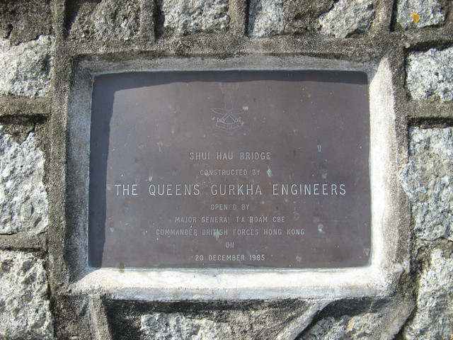 | 水口橋 | SHUI HAU BRIDGE CONSTRUCTED BY THE QUEENS GURKHA ENGINEERS OPENED BY MAJOR GENERAL TA BOAM CBE COMMANDER BRITISH FORCES HONG KONG ON 20 DECEMBER 1985 |