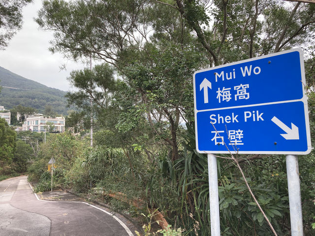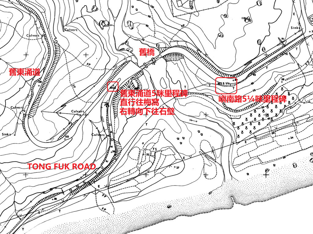 在接近舊東涌道及嶼南路路口,有一面路牌,標示直行往梅窩,右轉向下往石壁,好像有點奇怪?沿車路往下走,便會遇上5咪里程碑及另一面路牌,標示左轉往梅窩,右轉往石壁,這面路牌好像較正常,究竟背後有沒有原因?