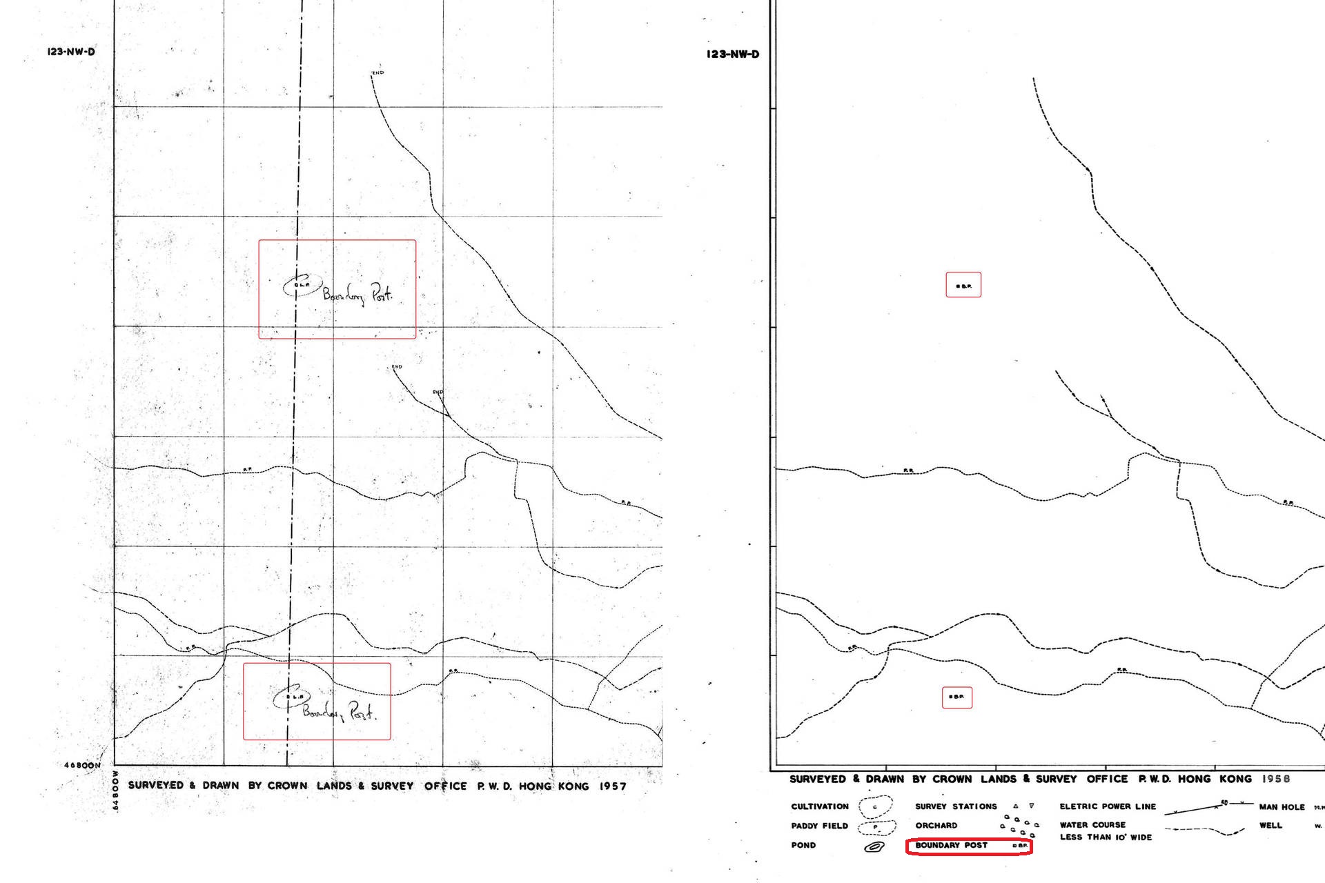 - 孖指徑(測量圖145-SW-A)1961及1969年測量圖標示為D164,1976年測量圖有D164及DT85,現時的測量站#410摘要則有註明(FORMER NO. DT85)