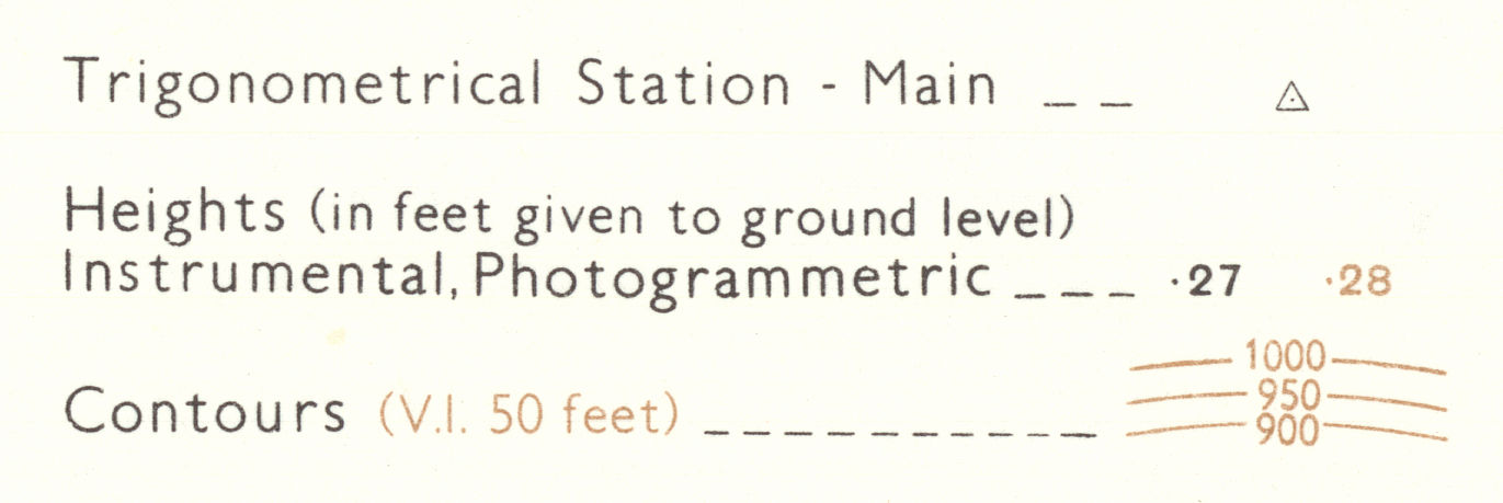 那裏可能會遇到昔日的測量墩?參考1960年代的地圖圖例,當時山體高度分別用啡色和黑色標示:啡色代表"Photogrammetric"(攝影測量法),無需親身到達現場進行測量;黑色代表"Instrumental", 代表曾經用儀器進行測量,這些地點有較大機會遇到昔日的測量墩。