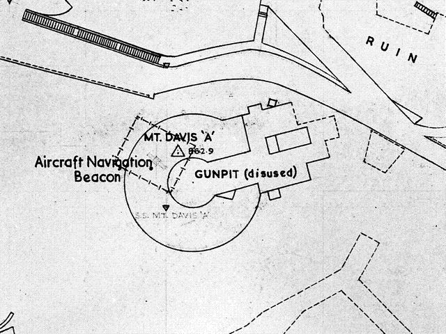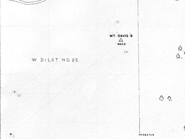 - 早於1962年測量圖,已經有「MT. DAVIS ‘A’」測量站,1974年3月測量圖仍然標示「MT. DAVIS ‘A’」,1974年10月測量圖不見了「MT. DAVIS ‘A’」名字,旁邊新增了「NB」標示