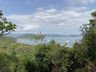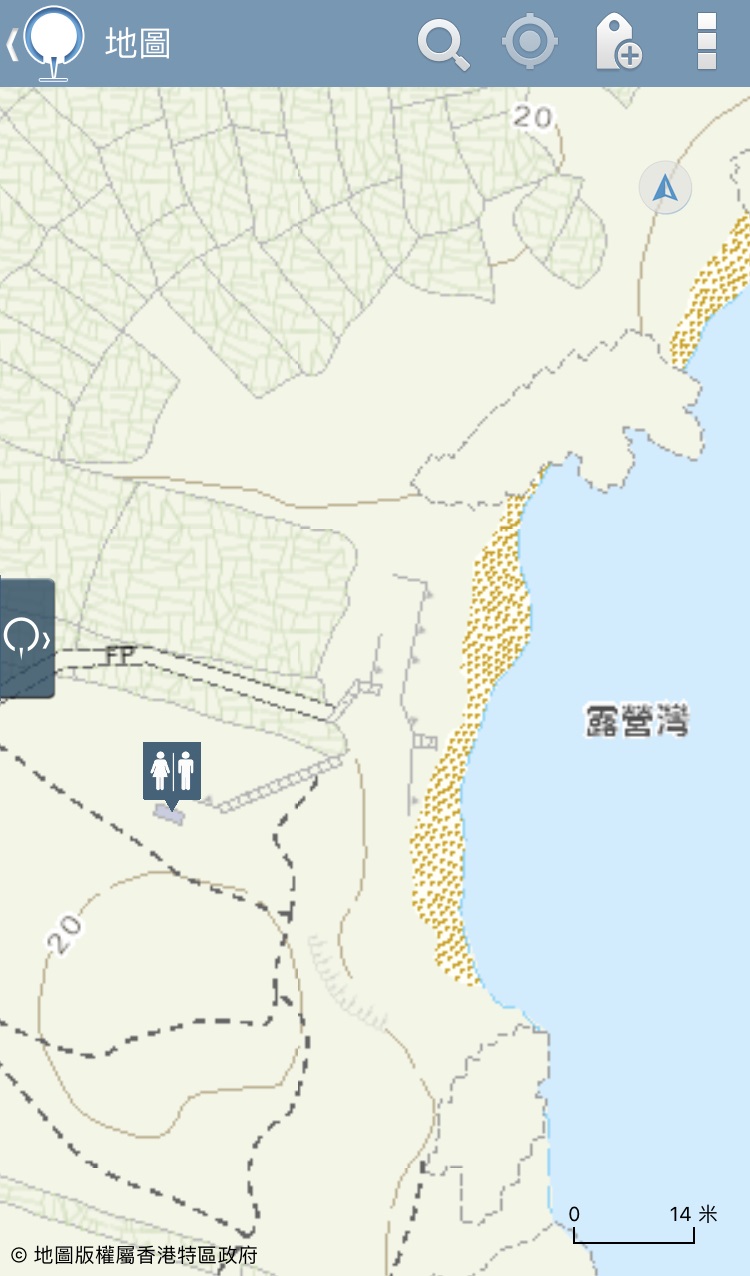 返回白色木橋,沿小徑上行,在路口右轉另一小徑,沿環山腰小徑前行,來到一個石灘,再前行不遠便到達露營灣(露營灣附近的全景照片)。沙灘後方有兩條小徑,先沿左邊小徑前行,探訪往竹角小徑的路旁、地圖有標示的一所廢屋,這兒附近有不少舊日汽水樽,或許以前這裏是一所士多。然後回走一小段小徑,經過昔日的戰壕,探訪機槍堡PB108。沿機槍堡左邊的小徑往上行,經過小山丘頂,來到現今地政總署地圖仍有標示的露營灣公廁,公廁有三格(似乎是一格男廁、兩格女廁),但應該已經多年無人打理。按地圖顯示,廁所旁邊有一道水泥梯級下降至岸邊,覓得梯級,下降數級已被植物阻擋,不能前進,只好步回公廁,沿樹叢中小徑下降回岸邊,看看通往公廁梯級的另一端。